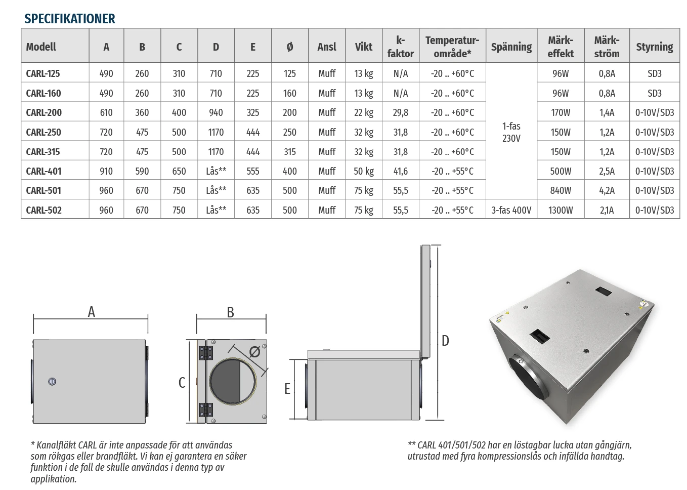 CARL 160 mm (Maxflöde 0,19 m³/s, 680 m³/h), CARL 200 mm (Maxflöde 0,33 m³/s, 1180 m³/h), CARL 250 mm (Maxflöde 0,49 m³/s, 1760 m³/h), CARL 315 mm (Maxflöde 0,55 m³/s, 1980 m³/h), CARL 400 mm (Maxflöde 1,05 m³/s, 3780 m³/h), CARL 500 mm (Maxflöde 1,70 m³/s, 6100 m³/h)